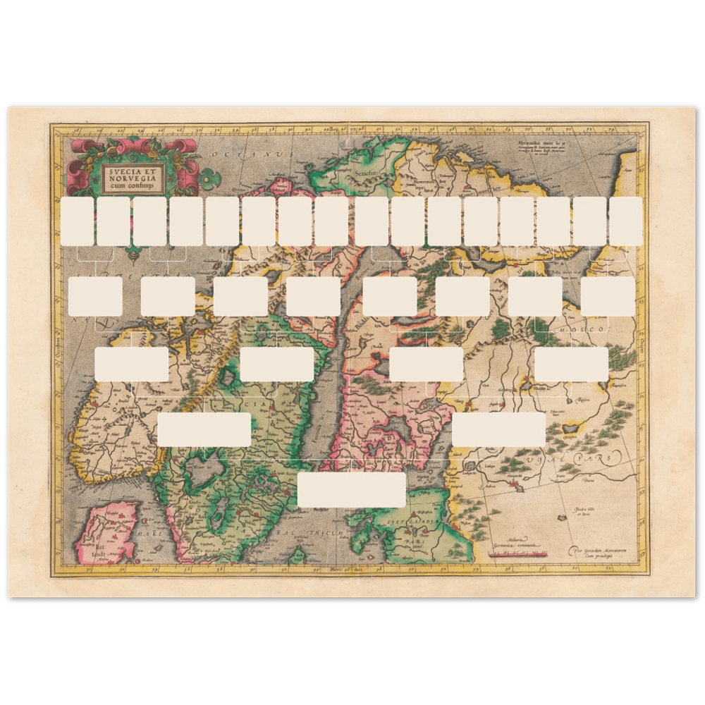 Ett färdigtryckt släktträd för en startperson och 4 generationer anor. Du fyller själv i uppgifterna i de tomma rutorna. Släkttavlan är tryck på 170 g/m² tjockt matt beständigt papper i storleken 70×50 cm.  Levereras ihoprullad i tub.