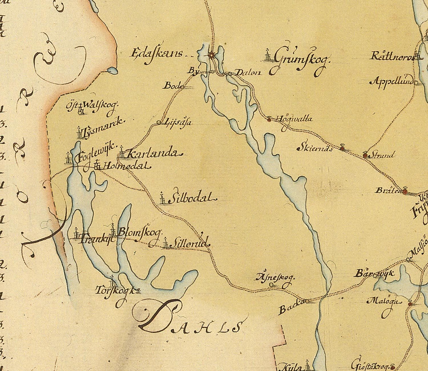 Nytryck av en historisk vägkarta över Närke och Värmland 1731. Detaljerat visar den vilka vägar som fanns och alla gästgivare – och postgårdar. Storlek 70×50 cm.